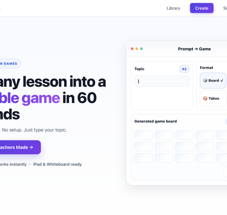 From idea to production-ready product đź”— Live platform: https://lessonvibe.com Overview LessonVibe is an AI-powered platform that enables teachers to create, customize, publish, and remix interactive ESL classroom games in seconds. The project was built to solve a real classroom problem:teachers want high-quality, level-appropriate speaking games, but they don’t have time to design them from scratch. LessonVibe combines pedagogical design, AI prompt …